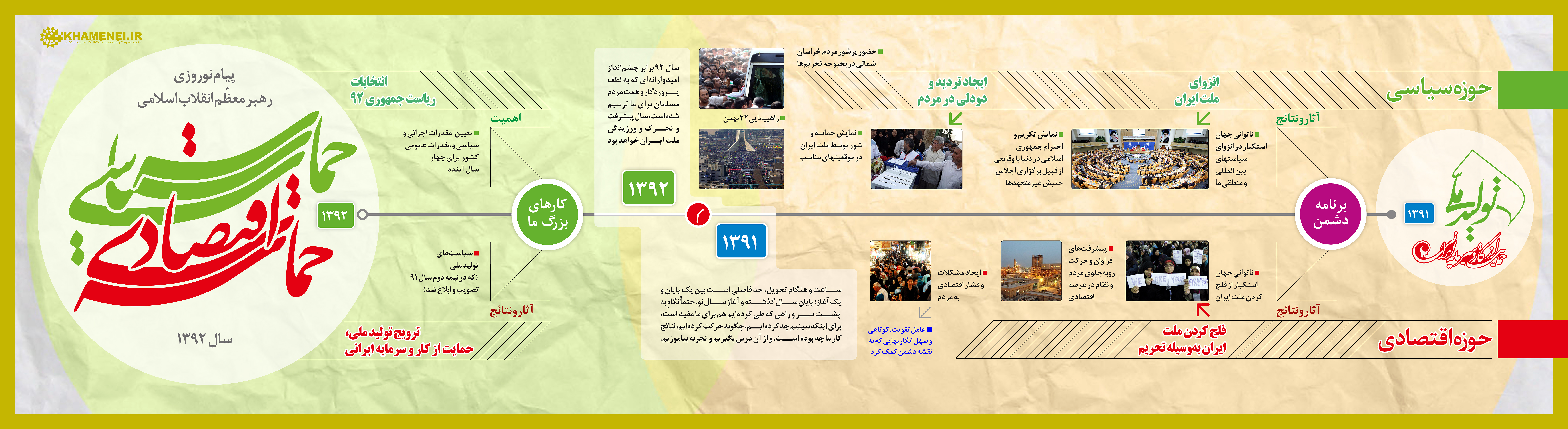 حضرت آیت الله خامنه ای در پیام به مناسبت آغاز سال ۱۳۹۲، چشم انداز این سال را امیدوارانه و همراه با پیشرفت و تحرک و ورزیدگی و حضور جهادی ملت ایران در عرصه های سیاسی و اقتصادی دانستند و تاکید کردند: با این نگاه، سال ۹۲ را "سال حماسهی سیاسی و حماسهی اقتصادی" نامگذاری میکنیم.